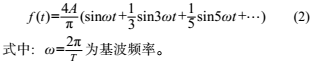 針對傳感器輸出信號的特點,顯然可知其是由基波頻率和奇次諧波疊加而成的。對于一個給定單峰值為A的矩形波信號,其傅里葉展開有如下形式: