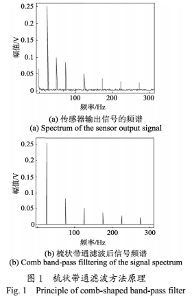 我們對采集到的實際傳感器輸出信號進(jìn)行頻譜分析后發(fā)現(xiàn)其頻譜范圍較寬,不僅含有明顯的基波和奇次諧波分量,在其他分量處也有值,如圖1(a)中所示的在0頻率分量處的直流漂移和50Hz頻率分量處的工頻干擾等。針對輸出信號的這種特點,采用梳狀帶通濾波器,該濾波器能保留特定的頻率分量,而抑制其他的頻率分量。這樣,如圖1(a)所示的傳感器輸出信號經(jīng)過梳狀帶通濾波器后,有用的基波和奇次諧波分量將通過濾波器,而其他分量將被大幅度的抑制,濾波后的信號頻譜如圖1(b)所示,可以較大程度地抑制噪聲的影響。