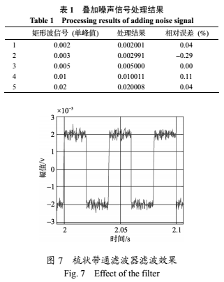 *先采用MATLAB產(chǎn)生上述疊加噪聲的信號,信號的頻率為25Hz,矩形波單峰值范圍為0.002~0.02,疊加上噪聲干擾后的信噪比范圍在-10.9dB~9.1dB。對產(chǎn)生的信號進(jìn)行梳狀帶通濾波,然后進(jìn)行幅值解調(diào),取進(jìn)入穩(wěn)態(tài)后的計算結(jié)果與準(zhǔn)確值進(jìn)行比較,得到的結(jié)果如表1所示,此時濾波器的帶寬b=1Hz。對圖6中的含噪聲信號的處理效果如圖7所示。