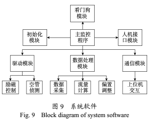 系統(tǒng)軟件設(shè)計采用模塊化設(shè)計方案,由主監(jiān)控程序程序統(tǒng)一調(diào)用。軟件總體框圖如圖9所示。系統(tǒng)軟件包含的主要功能模塊有:初始化模塊、驅(qū)動模塊、數(shù)據(jù)處理模塊、通信模塊、看門狗模塊和人機接口模塊等。