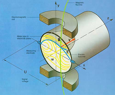 電磁流量計測量原理是基于法拉*電磁感應(yīng)規(guī)律。流量計的測量管是一內(nèi)襯絕緣材料的非導(dǎo)磁合金短管。兩只電*沿管徑方向穿通管壁固定在測量管上。其電*頭于襯里內(nèi)表面基本齊平。勵磁線圈由雙向方波脈沖勵磁時,將在與測量管軸線垂直的方向上產(chǎn)生一磁通量密度為B的工作磁場。此時,如果具有一定電導(dǎo)率的流體流經(jīng)測量管,將切割磁力線感應(yīng)出電動勢E。電動勢E正比于磁通量密度B,測量管內(nèi)徑d與平均流速 的乘積、電動勢E(流量信號)由電*檢出并通過電纜送至轉(zhuǎn)換器。轉(zhuǎn)換器將流量信號放大處理后,可顯示流體流量,并能輸出脈沖,模擬電流信號,用于流量的測量和控制。