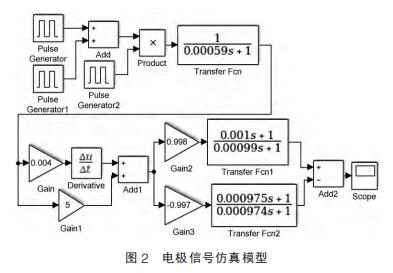 本文基于 Matlab 中 Siumlink 對電*信號進行仿真,勵磁方式為三值波勵磁,勵磁頻率 f=25Hz,傳感器參數(shù) D=40mm、Rx=88.8Ω、Lx=162mH,勵磁系統(tǒng)參數(shù) Ue=100V、穩(wěn)態(tài)電流 I0=200mA。基于電*測量回路搭建的仿真模型如圖 2 所示,圖中信號模塊 pulsGenerator 通過加法器、乘法器得到勵磁電流。由公式(1),在固定流速下感應(yīng)電勢與勵磁電流成正比,通過增加 Gain1 模塊得到感應(yīng)電勢信號。 對勵磁電流進行求導(dǎo)即經(jīng)模塊 Derivative 得到微分噪聲, 其中 Gain 值與 Lx 和 L1 相關(guān)。 感應(yīng)電勢與噪聲經(jīng)Add1 疊加之后得到電*信號 E1(t)。 scope 觀察輸出信號波形。仿真波形和真實波形如圖 3 所示。 將傳感器參數(shù)代入到勵磁電流穩(wěn)態(tài)調(diào)節(jié)時間公式中,得電流上升時間為 360μs,測得實際上升時間為 390μs,兩者相差不大,驗證了仿真模型的正確性。