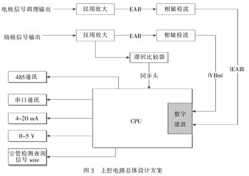 (2) 主控制電路上通過相敏檢波等一系列硬件電路再結(jié)合軟件進(jìn)行相位補(bǔ)償和零位補(bǔ)償進(jìn)一步消除正交干擾信號和同相干擾。為了保證測量的實(shí)時(shí)性和準(zhǔn)確性,先將勵(lì)磁信號和感生電勢信號進(jìn)行數(shù)字濾波,再利用軟件算法進(jìn)行除法運(yùn)算得到流速信號,借此來得到穩(wěn)定的實(shí)時(shí)流速。