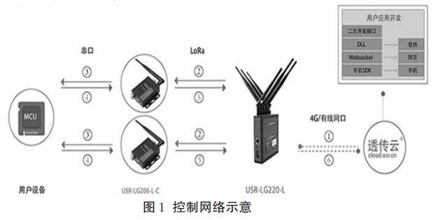 基于 LoRa 技術(shù)的無線流量計由控制,計量,通信,電源,存儲五個模塊組成。以空調(diào)水流量計為主體的計量模塊將采集到的供暖管道數(shù)據(jù)發(fā)送到通信模塊,基于 LoRa 技術(shù)的通信模塊將流量數(shù)據(jù)存儲并且發(fā)送到由管理人員監(jiān)控的控制模塊,管理人員通過控制模塊和通信模塊向流量計發(fā)送指示。電源模塊是無線流量計的能源中心,可以為流量計的其他模塊提供動力支持。流量計安裝完畢后可在小區(qū)內(nèi)形成控制網(wǎng)絡(luò),網(wǎng)絡(luò)示意圖如圖 1 所示。