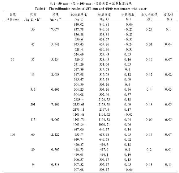 為了評測系統(tǒng)的實際應(yīng)用效果,進行了水流量標定實驗。分別針對50mm口徑與100mm口徑的傳感器進行標定。系統(tǒng)勵磁方式采用方波勵磁,勵磁頻率為12.5Hz,管道*大流速為7m/s左右,*小流速為0.3 m/s左右,標定結(jié)果如表1所示。