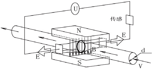如圖,測(cè)量流量時(shí),流體流過垂直于流動(dòng)方向的磁場(chǎng),導(dǎo)電性流體的流動(dòng)感應(yīng)出一個(gè)與平均流速成正比的電勢(shì)。其感應(yīng)電壓信號(hào)通過兩個(gè)電*檢出,并通過電纜傳送至轉(zhuǎn)換器,經(jīng)過信號(hào)處理及相關(guān)運(yùn)算后,將累計(jì)流量和瞬時(shí)流量顯示在轉(zhuǎn)換器的顯示屏上。