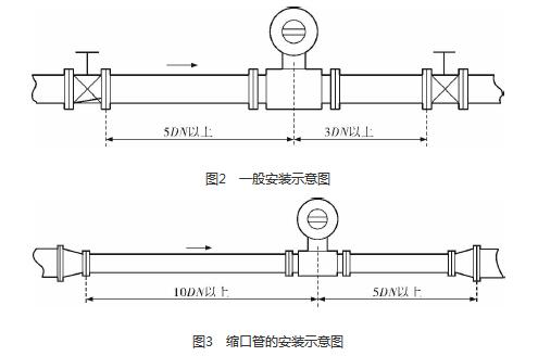 砂漿流量表的安裝質(zhì)量對其測量結(jié)果的影響較大,因此在安裝時需要注意幾個問題。*先,砂漿流量表直管段的選擇在配管時一定要按照要求進(jìn)行選擇,一般選擇流量計通徑與工藝管道通徑相同,即可滿足工程需要,而且安裝方便、壓力損失小,流量計直管段上游側(cè)的長度不少于5倍工藝管道直徑,下游側(cè)的長度不少于3倍工藝管道直徑(圖2)。但在流速太慢而又要求精度較高或需要變徑的應(yīng)用場合,可選擇通徑小于工藝管道通徑的流量計,以提高測量精度,此時流量計上、下游必須加裝異徑管,且進(jìn)口異徑管上游側(cè)應(yīng)有長于10倍工藝管道直徑的直管段,下游側(cè)應(yīng)有長于5倍工藝管道直徑的直管段(圖3)。