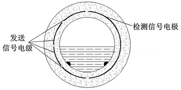 ①多電*式非滿管化工原料流量計。其底部是一對信號注人電*,中間有多對測量電*,頂端有一個滿管電*。在滿管情況下,該流量計與普通的化工原料流量計的功能相同,滿管情況下流體的橫截面積是固定的,此時計算流量值只需要測量流體的流速即可。當(dāng)流體非滿管時,滿管電*檢測到管道非滿狀態(tài),利用算法修正測量值,此時流量計的測量方式改成測量流體流速和液面高度。信號注人電*與在不同位置的三對測量電*共同工作,用于測量液位面的高度和流體的速度。多電*式非滿管化工原料流量計結(jié)構(gòu)簡圖如圖3所示。