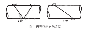 目前的流量計(jì)的基本測(cè)量原理和方法有以下三種:①時(shí)間差法,②相位差法,③頻率差法。現(xiàn)在國(guó)內(nèi)外的大多數(shù)非接觸式超聲流量計(jì)使用的都是頻差法。例如富士株士會(huì)社生產(chǎn)的FLB-1型超聲流量計(jì)使用的就是這種方法。它提供了可供選擇的兩種探頭安裝方法。如圖1所示。其中V法適用于小管徑的管道,而Z法則適用于2000mm或更大管徑的管道。另外,當(dāng)無(wú)法提供合適的安裝間距時(shí),宜于采用Z法,因?yàn)閆法僅需V法間距的一半,同時(shí),在流體速度很高時(shí),也應(yīng)選擇Z法。當(dāng)管內(nèi)壁的污垢很厚時(shí),也不適用反射式的V法而選用Z法。但不論采用哪種方法,都很難排除隨機(jī)的噪聲干擾,造成較大的誤差。因此,我們?cè)O(shè)計(jì)了一種新型的相關(guān)式超聲流量計(jì)。