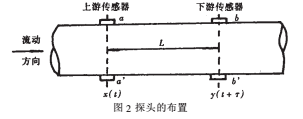 相關(guān)檢測(cè)技術(shù)在國(guó)內(nèi)外文獻(xiàn)中研究得很多,但在自來(lái)水流量測(cè)量中付諸實(shí)現(xiàn)仍是難的課題,本文所采用的相關(guān)檢測(cè)方法如圖2所示。在管道上裝有兩組傳感器,上游傳感器和下游傳感器,兩組傳感器之間距離L。相關(guān)檢測(cè)的實(shí)質(zhì)是測(cè)出流體通過(guò)線(xiàn)性系統(tǒng)時(shí),走過(guò)L長(zhǎng)的距離所需的時(shí)間T。
