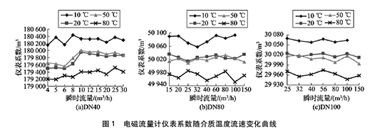 將實驗測得的水泥計量表在不同溫度及流速下的儀表系數(shù)數(shù)據(jù)整理,特性曲線如圖1所示,3組曲線分別對應DN40, DN80, DN100的3塊水泥計量表的儀表系數(shù)曲線。