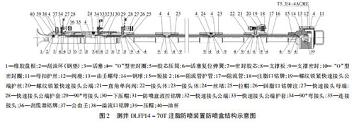 如圖 2 所示,DLFP14 - 70T 注脂防噴盒有 1 個(gè)注脂口、1 個(gè)回脂口、1 個(gè)防噴盒液控口、1 個(gè)刮纜器液控口及1 個(gè)溢流口,主體內(nèi)裝有 6 根阻流管。DLFP14 - 70T 注脂防噴盒采用 4 級(jí)密封: * 1 級(jí)密封采用注脂密封,撬裝注脂泵從注脂口注入高壓高粘度密封脂于 6 根阻流管與電纜間隙; * 2 級(jí)密封采用液壓密封,氣動(dòng)液壓泵主加壓和手壓泵補(bǔ)加壓結(jié)合從防噴盒液控口注入液壓油,推動(dòng)活塞擠壓膠芯壓筒; * 3 級(jí)密封采用液壓密封,手壓泵加壓從刮纜器液控口注入液壓油,推動(dòng)活塞擠壓膠芯壓筒實(shí)現(xiàn)密封和刮油作用; * 4 級(jí)密封油杯、橡膠盤根和刮油環(huán)( 鋼 墊) 。DLFP14 - 70T 注脂防噴裝置配有液控上、下捕捉器、液控雙閘板防噴器和放噴組件,根據(jù)實(shí)際可以調(diào)整溢流量,實(shí)現(xiàn)零溢流密閉測(cè)井施工。 DLFP14 - 70T 注脂防噴裝置工作壓力 70 MPa,耐壓105 MPa。