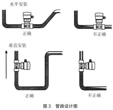現(xiàn)場(chǎng)安裝時(shí)應(yīng)注意遠(yuǎn)離可能對(duì)其產(chǎn)生干擾的大型設(shè)備,防止長(zhǎng)期的熱輻射和其他如磁場(chǎng)直射等環(huán)境影響。為確保高測(cè)量精度和較好的零點(diǎn)穩(wěn)定性,進(jìn)行校正前,二次供水流量計(jì)應(yīng)裝入工藝介質(zhì)中至少 24 小時(shí)電*鈍化。安裝的管路設(shè)計(jì)應(yīng)確保管道始終充滿流體,防止測(cè)量誤差,管路設(shè)計(jì)圖見圖 3。