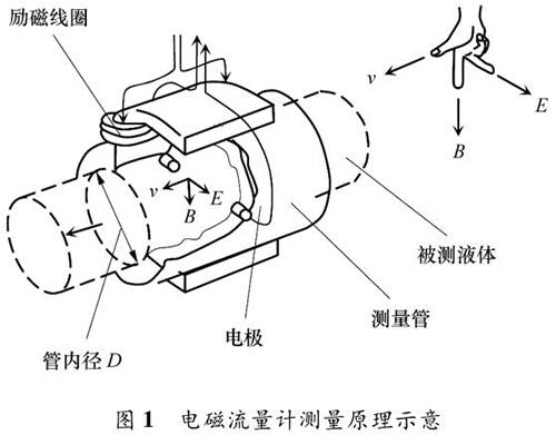 一體式污水流量表的測量原理如圖 1 所示。根據(jù)法拉*電磁感應(yīng)定律,導(dǎo)電液體在磁場中流動會產(chǎn)生電動勢 E,它與磁感應(yīng)強(qiáng)度 B、導(dǎo)電液體平均流速 v 成一定比例關(guān)系: