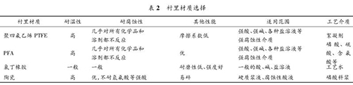 一體式污水流量表要根據(jù)被測流體的溫度、壓力、速度以及含固顆粒的硬度、含量和粒徑大小來決定測量管內(nèi)襯的材質(zhì)。該濕法磷酸裝置中,一體式污水流量表測量管襯里材質(zhì)的種類見表 2。