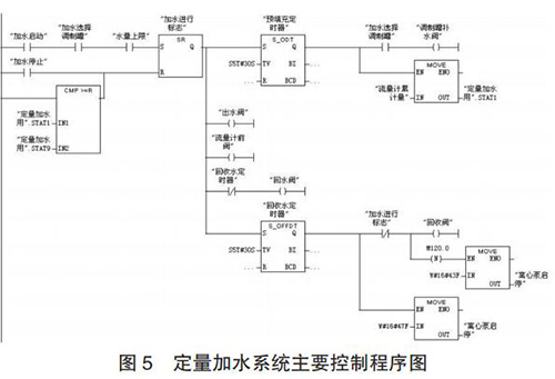 定量加水系統(tǒng)的工作過程為:當設定好加水量后,啟動系統(tǒng),多級離心泵 10、回流閥 4、出水閥 9 和流量計前閥 12開啟對管路進行預填充;延時 30s 預填充完成后,回流閥 4關閉,調(diào)制罐補水閥 14 開啟,同時質(zhì)量流量計 13 開始計量;當質(zhì)量流量計的累積量與設定加水量一致時,出水閥 9 和調(diào)制罐補水閥 14 關閉;調(diào)制罐定量加水完成后,開啟回收閥17 和回流閥 4 以及同未關閉流量計前閥 12 一起,利用壓縮空氣對管道中水實現(xiàn)回收;延時 30s 水回收完成后,關閉多級離心泵、球閥 4、12 和 17,定量加水過程完成。定量加水系統(tǒng)主要控制程序如圖 5 所示。