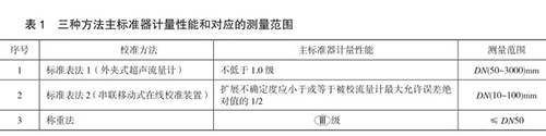 本規(guī)范包含三種校準(zhǔn)方法,分別為標(biāo)準(zhǔn)表法 1(外夾式超聲流量計(jì))、標(biāo)準(zhǔn)表法 2(串聯(lián)移動式在線校準(zhǔn)裝置)和稱重法,編制組對每種方法進(jìn)行了大量的實(shí)驗(yàn),并積*與工業(yè)廢水流量表生產(chǎn)廠家及用戶溝通探討,積累了豐富的經(jīng)驗(yàn),獲得了大量的實(shí)驗(yàn)數(shù)據(jù),*終確定三種方法的主標(biāo)準(zhǔn)器計(jì)量性能和對應(yīng)的測量范圍,如表 1 所示。