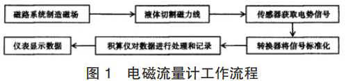 密封水流量計的產生主要是基于法拉*電磁感應定律。在密封水流量計的應用中,磁路系統(tǒng)會在流量計運行過程中逐步出現(xiàn)直流磁場與交流磁場,該磁場的產生為后期的測量提供了良好的前提條件,營造了測量所需的磁場環(huán)境,因此,在密封水流量計應用時,一旦被測液體在導管中經過該磁場環(huán)境時,必然會產生一定的切割磁力線運動,在這種情況下,電*傳感器就會發(fā)揮其作用,將導管內的流量轉換為感應電勢信號,隨后此轉換形成的信號逐步被傳遞給轉換器。而轉換器更是可以將所獲得的流量信號等加以處理,通過分析、對比等,轉換器會將該信號變?yōu)闃藴市盘枺S后將該信號輸出給積算儀,進一步進行信號的處理,這些處理以后的信號*終會在密封水流量計的儀表中顯示,呈現(xiàn)*終的流量測量結果,其基本的流程如圖 1 所示。