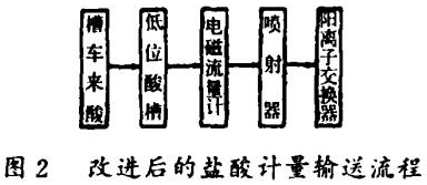 該系統(tǒng)工藝復(fù)雜,操作困難,安全性低,在一次向高位酸槽壓送濃鹽酸的過程中,曾發(fā)生過鹽酸噴出傷人的事故。因此對整個系統(tǒng)進(jìn)行了改進(jìn)(見圖2)