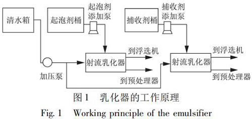 選煤廠浮選藥劑乳化裝置是將藥劑和水制成乳化液,實現(xiàn)藥劑的合理使用,將對浮選效果和節(jié)約藥劑起到一定的作用。在使用中可根據(jù)藥劑和水的配制比例觀察藥劑的乳化效果,通過乳化器操作箱內(nèi)的的電位器調整水泵轉速,即調整乳化壓力。自動加藥控制是根據(jù)入浮流量與入浮濃度的檢測結果,控制起泡劑與捕收劑的加入。乳化器的工作原理如圖 1 所示。