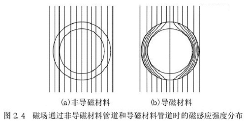 1.測量管:主要是傳感器的管道,該管道由高導電率非導磁材料制成,可保證流體在通過時能夠表現(xiàn)出自身的電磁效應,在該管道內中安裝了內襯。使用非導磁材料的原因是保證勵磁線圈中所產(chǎn)生的磁場不會順著管道流走,確保測量管道內部產(chǎn)生明顯的磁感應線,下圖 2.4 中展示了利用非導磁材料和導磁材料管道中所產(chǎn)生磁感應線的情況。