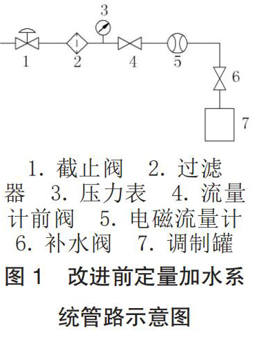 工廠的香料廚房系統(tǒng)為國內(nèi)煙機公司 2004 年設(shè)計制造,其定量加水系統(tǒng)主要由水源、智能法蘭式電磁流量計、加水管路元件和控制程序這四部分組成,改進前管路示意圖如圖 1 所示。