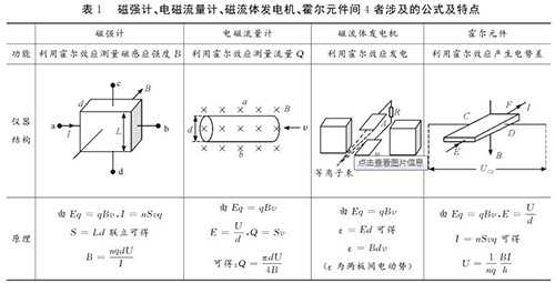 易錯點2:磁強計、分體式電磁流量計、磁流體發(fā)電機、霍爾元件間的區(qū)別與聯(lián)系磁強計、分體式電磁流量計、磁流體發(fā)電機、霍爾元件都是利用電磁場對帶電粒子的偏轉(zhuǎn)效應(yīng),并且穩(wěn)定時電場力與磁場力均達到平衡。很多學(xué)生容易將其混淆,遇到問題常常搞不清原理,亂代公式,筆者特將4者涉及的公式及特點等做一對比區(qū)別如表1所示。