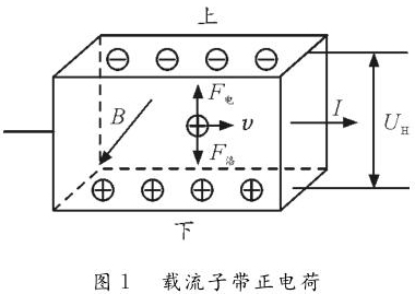 情形1:單種載流子。如圖1所示,若載流子帶正電荷,則載流子在洛倫茲力作用下會向下偏轉(zhuǎn),導體下表面積累正電荷。同時,上表面失去正電荷而帶上負電,從而使下表面電勢高于上表面。