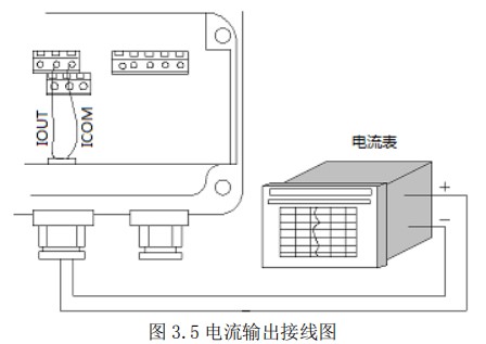 使用電流輸出線(4-20mA)時(shí),應(yīng)注意到導(dǎo)線的電阻與負(fù)載電阻之和不得大于 750Ω 。電流輸出接線見(jiàn)圖 3.5。