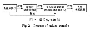 江都泵站曾按ISO標準規(guī)定位置布置26臺流速計,測量大型水泵3.5m×1.5m矩形出水流道平均流速,以校準用差壓法測量泵進水道差壓的流出系數(shù),測量流速在1.2~1.3m/s之間。期間還用食鹽濃度法校準流速計面積法,在實驗過程中再用食鹽濃度法復核流速計面積法的數(shù)據(jù)。量值傳遞流程如圖2所示。