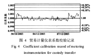 兩臺儀表中一臺日常貿(mào)易交接計量儀表由另一臺參比表(master meter)核查和校驗。圖4所示是貿(mào)易計量儀表流量在4000~5500m³/h時的校驗記錄,變化在原校準儀表系數(shù)的±0.180%范圍內(nèi),*大變化為0.090%,標準偏差為0.045%。
