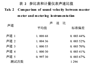 再從計量儀表與參比表五個聲道的各聲道間,求取聲速比值考察儀表的穩(wěn)定性,表2摘錄流量在5500m³/h時的聲速比,五個聲道兩儀表聲速比變化*大為0.006%。