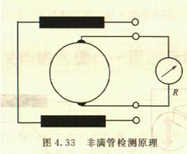 非滿管檢測也是基于電導(dǎo)率檢側(cè)的方法。在圖4.33所示的電磁流量傳感器中,增加了一個(gè)(或一對(duì))非滿管檢測電*。當(dāng)導(dǎo)管內(nèi)液體滿管時(shí),頂部電*與其他電*之間的電阻值很小;而當(dāng)存在非滿管情況時(shí),頂部電*與導(dǎo)電液體之間有氣體阻隔,所以電*電阻顯著增大,從而做出非滿管判斷。
