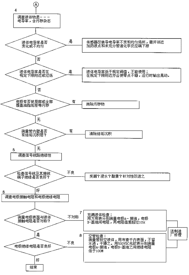 檢查流程圖*5項(xiàng)。信號回路絕緣下降會形成零點(diǎn)不穩(wěn)。信號回路絕緣下降的土要原因足,包*部位絕緣下降所引起的,但也不能排除信號電纜及其接線端子絕緣下降或破壞。因?yàn)橛袝r(shí)候現(xiàn)場環(huán)境十分嚴(yán)酷,稍一疏忽儀表蓋、導(dǎo)線連接處密封不慎,彌漫著潮氣酸霧或粉粒塵埃侵入儀表接線盒或電纜保護(hù)層,使絕緣卜降。信號回路絕緣電阻檢查分別按電纜側(cè)和流量傳感器側(cè)兩郵分進(jìn)行,用兆歐表測試。因信號電纜容易可先做。流量傳感器再分兩次進(jìn)行:充滿液體測黽電*表面接觸電阻和個(gè)管后測量,U*絕緣電阻。