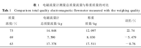 其次提取電磁流量計的流速數(shù)據(jù)換算并積分后與稱重質(zhì)量進行對比,分析其數(shù)據(jù)誤差,結(jié)果如表1。可以通過電磁流量計積分后的總流量與稱重數(shù)據(jù)的吻合程度來分析,若二者吻合較好則說明電磁流量計在線測量數(shù)據(jù)顯示雖然可能受到氣泡的影響,但是總流量可以準(zhǔn)確測量;若二者相差較大,則說明電磁流量計不適合對較高質(zhì)量濃度煤泥進行測量。從表1可以看出電磁流量計在質(zhì)量濃度為69%,73%時誤差較大,故測量不準(zhǔn)確;在質(zhì)量濃度為63%時測量誤差較小,說明其測量較準(zhǔn)確。該對比實驗與之前的重復(fù)性分析相符,說明用質(zhì)量濃度及電導(dǎo)率來評價電磁流量計測量數(shù)據(jù)的準(zhǔn)確性有一定的可行性。