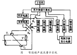 智能超聲波流量計(jì)的系統(tǒng)結(jié)構(gòu)如圖2所示。其工作過(guò)程是:在上位機(jī)的控制下,單片機(jī)先對(duì)計(jì)數(shù)器清零,使開(kāi)關(guān)K1閉合,K2合向下邊,然后控制同步電路發(fā)出同步啟動(dòng)脈沖,觸發(fā)超聲波換能器T1發(fā)射*1個(gè)超聲脈沖波,同時(shí)使計(jì)數(shù)電路開(kāi)始對(duì)周期為f的高頻方波進(jìn)行計(jì)數(shù)。該超聲脈沖順流傳播,至T2處被接收并轉(zhuǎn)換成電信號(hào),經(jīng)過(guò)放大、整型,一部分返回代替同步信號(hào)觸發(fā)T1再次發(fā)射超聲波,如此反復(fù)形成順流發(fā)射聲循環(huán),另一部分進(jìn)入分頻電路進(jìn)行分頻。當(dāng)聲循環(huán)M次,分頻器滿(mǎn)并產(chǎn)生一信號(hào),關(guān)斷高頻方波,使計(jì)數(shù)停止計(jì)數(shù)。同時(shí)單片機(jī)斷開(kāi)K1停止聲循環(huán),讀取鎖存器中的順流發(fā)射聲循環(huán)計(jì)數(shù)值N1。然后單片機(jī)再對(duì)計(jì)數(shù)器清零,再使開(kāi)關(guān)K1閉合,K2 合向上邊,觸發(fā)換能器T2 發(fā)射。此次,T2 發(fā)射T1接收,形成逆流發(fā)射聲循環(huán),同樣可得到逆流發(fā)射聲循環(huán)計(jì)數(shù)值N2。當(dāng)聲循環(huán)次數(shù)M足夠大,由于統(tǒng)計(jì)作用,上述2次聲循環(huán)的固有電聲延遲 (包括超聲波經(jīng)過(guò)換能器透聲斜楔、管圖2智能超聲波流量計(jì)系統(tǒng)壁等所需的時(shí)間以及電信號(hào)滯后的時(shí)間)之和是相等的,于是當(dāng)f已知且固定不變時(shí),根據(jù)上述公式可將2個(gè)計(jì)數(shù)值之差 (N2 -N1)換算成流體流速V和流量Q。