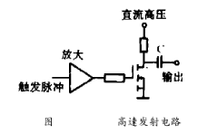 超聲波發(fā)射和接收電路的優(yōu)劣對(duì)整機(jī)性能影響很大。本流量計(jì)聲循環(huán)頻率達(dá)30kHz以上,而傳統(tǒng)的超聲波發(fā)射電路都是由可控硅構(gòu)成,開(kāi)關(guān)速度慢,使得工作頻率只有幾kHz,無(wú)法滿(mǎn)足要求,因此選用新型MOS作為發(fā)射元件,不但提高了工作速度,而且還提高發(fā)射工作電壓,增大了發(fā)射信號(hào)強(qiáng)度。如圖3所示,當(dāng)外加觸發(fā)脈沖時(shí),MOSFET導(dǎo)通,電容C迅速放電,產(chǎn)生一個(gè)高壓負(fù)脈沖,驅(qū)動(dòng)超聲波換能器發(fā)射超聲波。