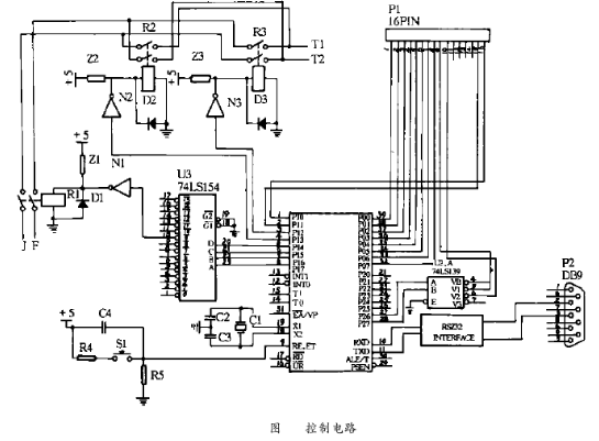 圖中單片機(jī)89C5 1和譯碼器74LS139構(gòu)成計(jì)數(shù)板上鎖存器的片選信號(hào),通過(guò)片選信號(hào)和P0口讀入計(jì)數(shù)值;單片機(jī)89C5 1、譯碼器74LS15 4和繼電器D1可切換檢測(cè)多個(gè)定子線(xiàn)棒支路間的超聲信號(hào);繼電器D2和D3等完成一組超聲換能器收發(fā)功能的互換;單片機(jī)RXD和TXD引腳經(jīng)RS - 2 32電平變換,完成同上位機(jī)的通訊任務(wù)。