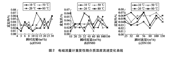 將實驗測得的pvc排水管流量計在不同溫度及流速下的重復(fù)性數(shù)據(jù)整理,特性曲線如圖2所示,3組曲線分別對應(yīng)DN40, DN80, DN100的3塊pvc排水管流量計的重復(fù)性曲線。